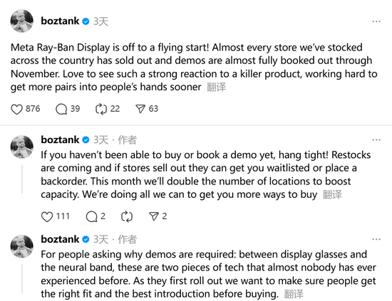 博斯沃思表示,目前这款产品的市场反应强于预期,公司正在努力跟进。并且补货即将到来,本月将增加一倍的销售点数量,从而保证供货量。目前,Meta正在评估未来是否支持在线订购。